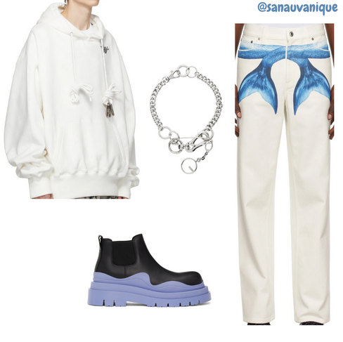 Left: Hoodie: We11done, Necklace: Martine Ali, Shoes: Bottega Veneta